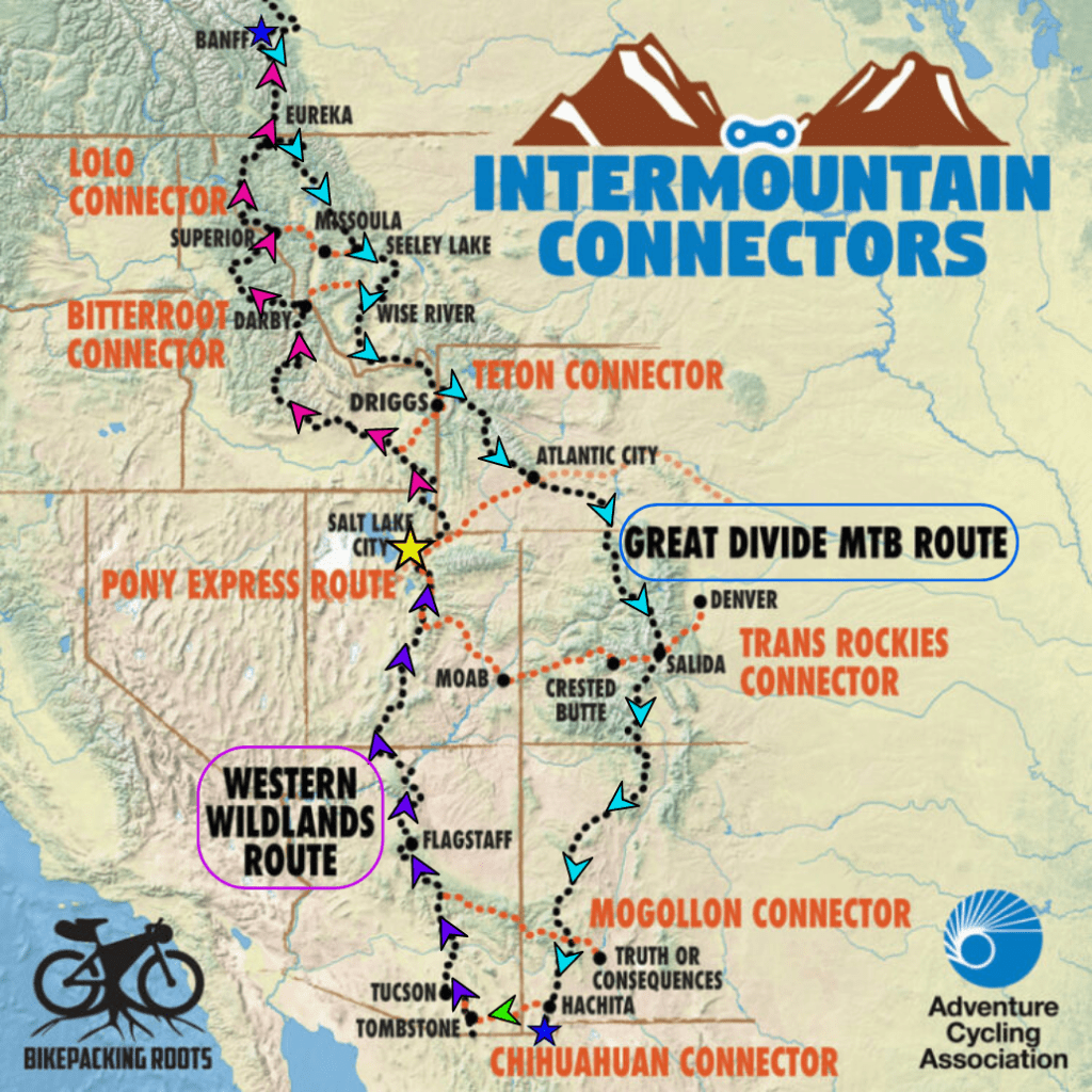 We’ll start traveling north along the Western Wildlands Route at the yellow star in Salt Lake City. We hope to reach the blue star in Banff, Canada. From there, we’ll send it southwards on the Great Divide Mountain Bike Route to the Mexico/US border. Then we’ll traverse back over to Western Wildlands and head back up north to SLC!