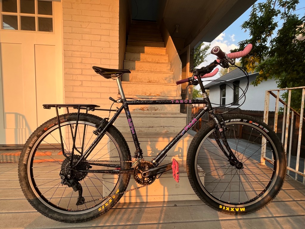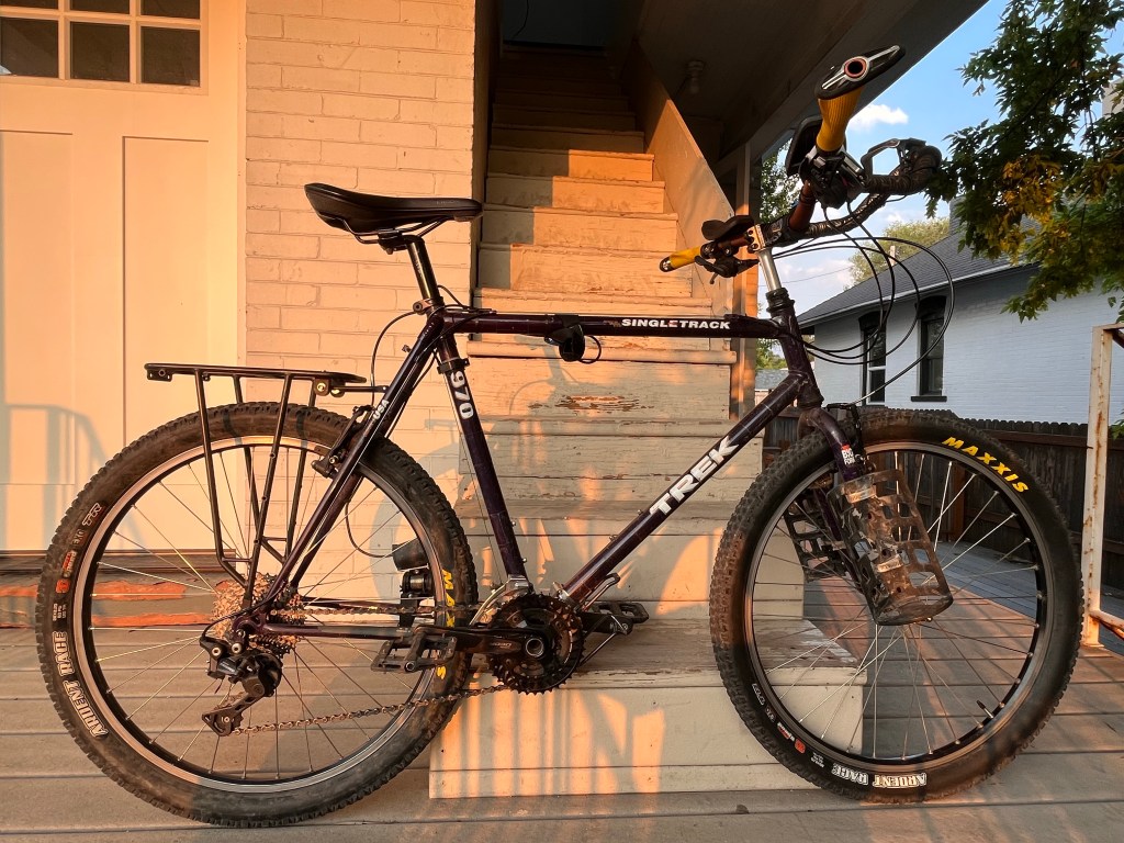 I am riding a 1992 Trek Singletrack 970 in the delightful “sour grape” color. In ‘92 this was a high tech mtb race machine, but based on its minty fresh paint job it probably sat in a Salt Lake City basement for most of its life until I scooped it up and attached an enormous number of accessories to it. It was the largest frame available that year, and I am a very average size so there is some risk to future generations every time I come to a stop, but that also means it accommodates a huge frame bag which makes it an excellent expedition vehicle. It is a disturbing weight as pictured and that’s without bags or gear or water. But it’s damn sturdy and has a cool paint job so it’s the perfect bike for the job…??