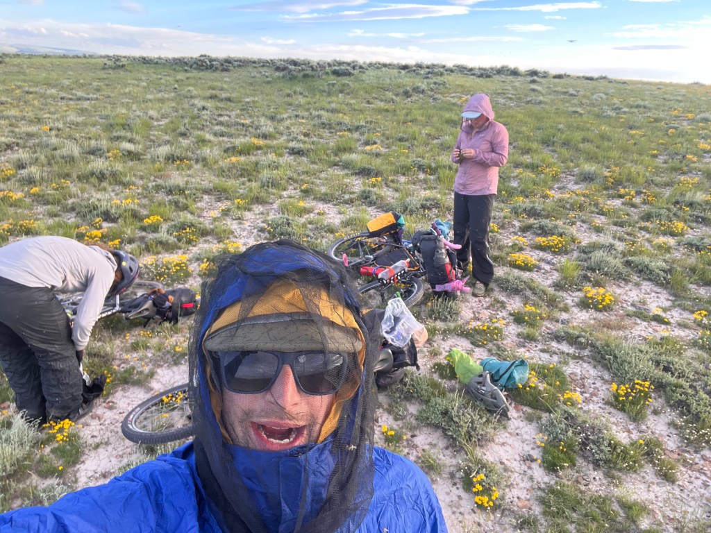 • Headnets = most valuable gear. On our second night, just outside of Evanston, WY, we experienced the thickest, most thirsty mosquitos I’ve ever seen. Any bit of skin was instantly coated with bugs as soon as we stopped riding. It was a hellacious and desperate scramble as Rachel, Jack and I searched to find a scrappy camp on the side of the highway while being absolutely devoured. We all quickly wriggled into the most impenetrable gear we had: rain gear, puffy pants, Rach even kept her helmet and riding glasses on!! Jack and I pulled on our headnets, which was the only way we were able to be outside long enough to boil water for dinner that night. Amen to the headnet and I will NEVER travel without one now.