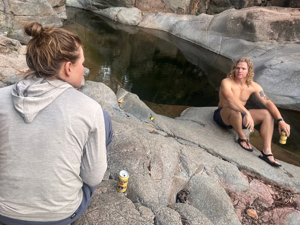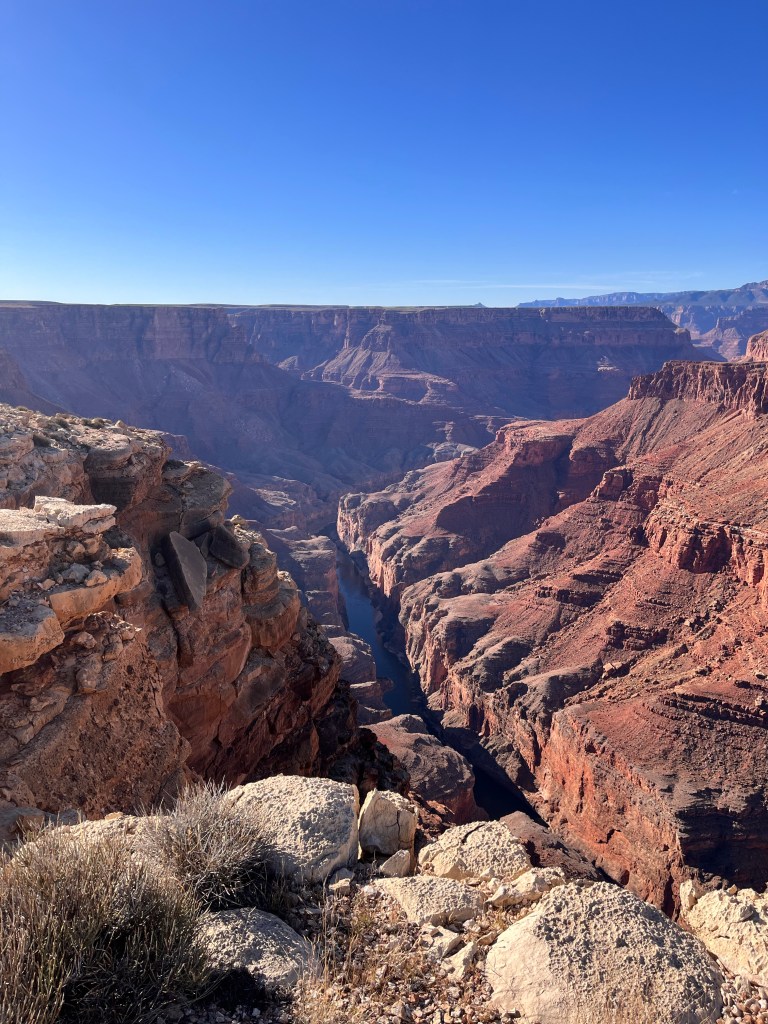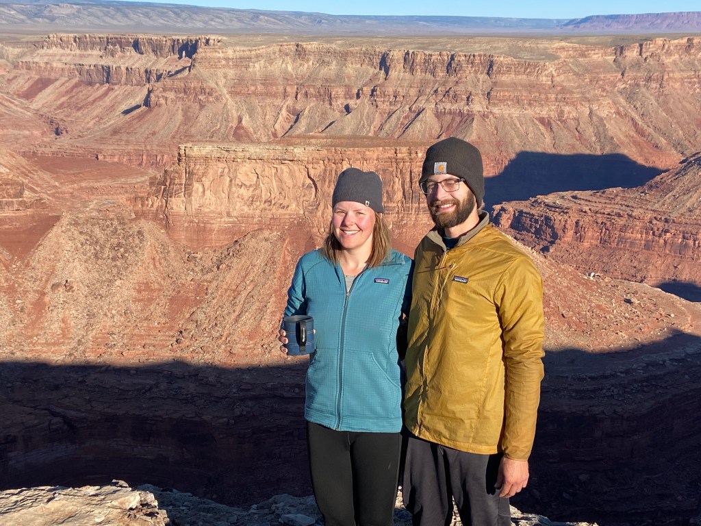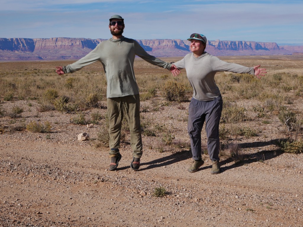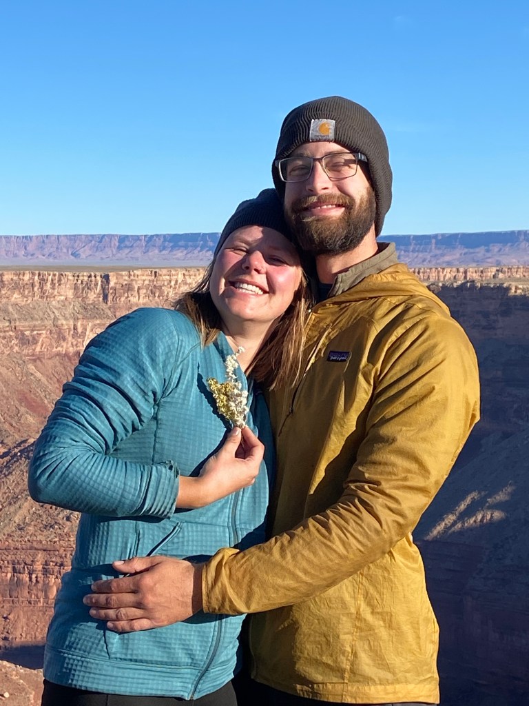 In the morning we were greeted by an incredible view of the Grand Canyon, with not a single other human in sight. We drank coffee on the rim of the canyon and then I proposed to Zoey with a desert flower bouquet wrapped with dental floss. I had been trying to sort out a time and place and the logistics of finding a ring for a while and been stumped, but the sheer majesty of the place, along with the huge effort of the day before and the upcoming conclusion of our trip, compelled me to make the spontaneous gesture. Because I had decided on the proposal moments before, I didn’t forewarn anyone and gathered the bouquet on my way back from going to the bathroom in the desert, as that was the only time I had alone to secretly enact my plan. I asked Lynn to take a photo of us, and then got down on one knee, to which Zoey asked twice if I was joking and burst into tears when I assured her I wasn’t. Lynn exclaimed, “holy fuck!” and Tom had a comically stunned look on his face. Zoey said no, threw the bouquet off the cliff and then me shortly after. After I climbed back up to show I was really serious, she said yes. Then we all went and looked at fossils embedded in the canyon walls.